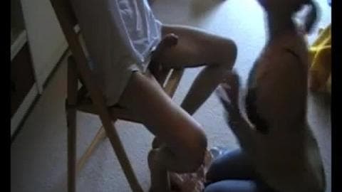 Esse cara senta em uma cadeira pequena e espera que essa linda loira faça todo o trabalho. Ele faz tão bem que o cara corre super rápido.