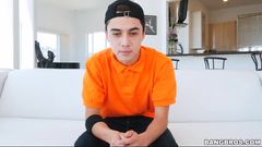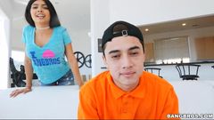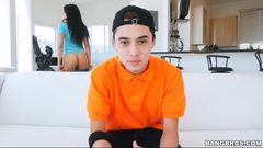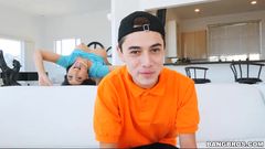 Um jovem bastante passivo recebe uma garganta profunda e é fodido por uma morena. 69, buceta peluda e gozada facial!