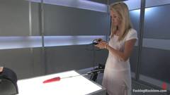 A loira bonita com mamas pequenas pode provar que esta máquina de foder está apenas funcionando corretamente. Sua buceta está pingando!