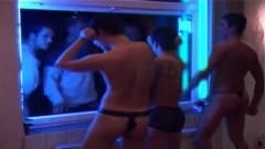 Trio bissexual após uma festa de swing. No apartamento de Daniela Steiner, eles começam a foder e os caras ejaculam sobre o corpo da garota.
