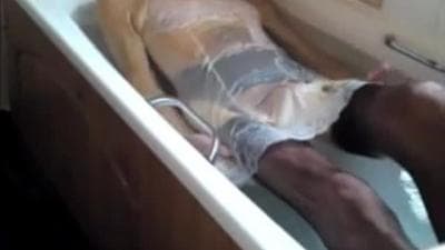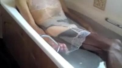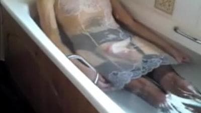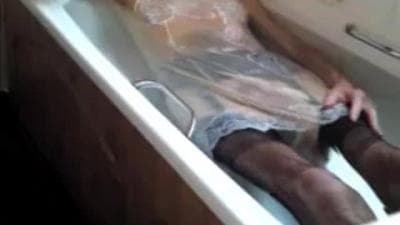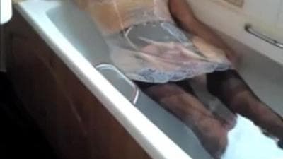 Por estar na banheira, esse gay veste meia-calça preta e seu pênis está parando, pois isso o excita muito e o estimula ao máximo.