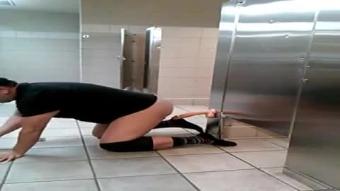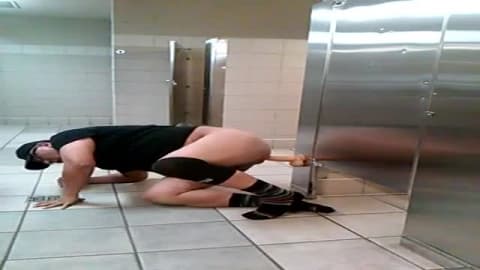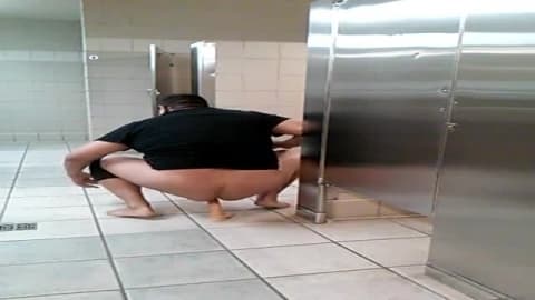 Aqui vemos um homem gordinho que entra em um banheiro público e começa a se masturbar com um vibrador que pode ser preso a qualquer parede.