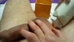 Essa mulher não gosta de ver o pau cabeludo de seu marido, então hoje ela o raspa loucamente com cera. Até as bolas estão completamente descascadas.
