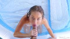 Uma jovem entra em uma piscina inflável com o corpo cheio de óleo e abre bem as pernas para que o cara a perfure profundamente.