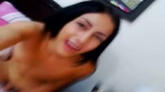 Essa transexual sexy com longos cabelos escuros se diverte se masturbando e nos mostra seu pau duro.