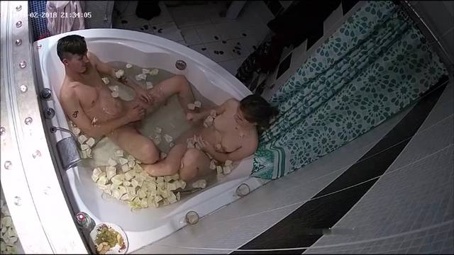 A amadora Evi entra no banheiro e Alan a segue. A visão da câmera de cima mostra-os em uma banheira com pétalas de rosa. Eles fornecem e fodem.
