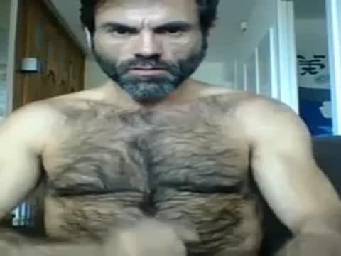 Este velho com um corpo musculoso e muito peludo está sozinho em casa. Ele está se divertindo se masturbando na frente da câmera