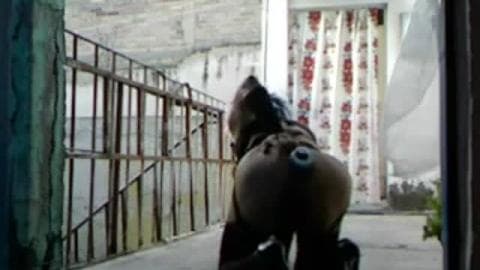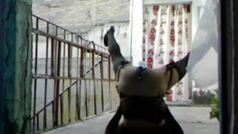 Esse cara se diverte se vestindo com roupas íntimas femininas e saindo na varanda com um brinquedo na bunda.