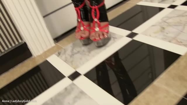 Esta garota trans dominante adora roupa de latex. Ela abre bem o cuzinho e enfia um plug antes de ser penetrada pelo pau do cara, e receber a porra no cu!.