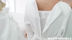Uma bonita loira senta-se na mesa para ser examinada por um cara. A boceta nua será tocada enquanto o cara goza em cima dela