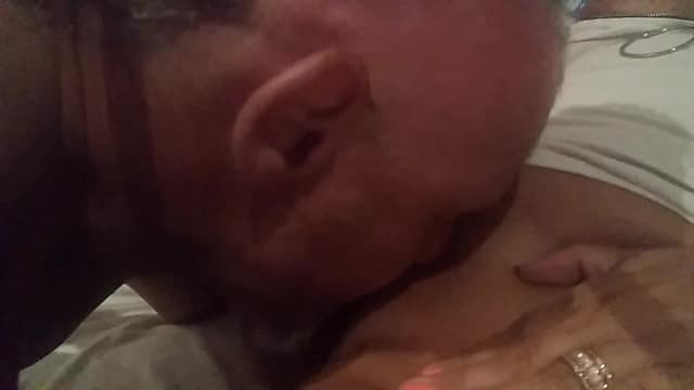 Meu marido me dá algumas boas lambidas na buceta que eu gozo, ele sobe em cima e masturba meus seios grandes.