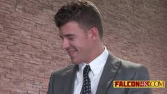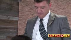 Esses dois estão conversando, mas um deles prefere falar sobre sexo. Seu amigo coloca o pênis à sua disposição, para que ele possa desfrutar.