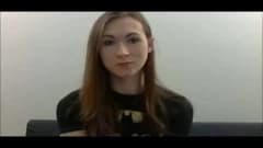 A garota fala com os fãs e mostra o pênis e a bunda dentro da calcinha. Ela despe-se, passa um pequeno vibrador na cabeça do pau e se masturba até ejacular