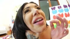 Morena Samantha tem um grande espólio, mas o ator pornô Chris Strokes não tem medo de empurrar seu grande pinto pelo rabo dela acima.