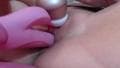 Essa morena está sentada com a buceta de frente para a câmera e está excitada como uma brasa, por isso usa os seus brinquedos e dedos.