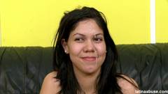 A latina faz uma garganta profunda antes de ser fodida no sofá e recebe uma dose dupla de esperma na testa, pois ela queria muito.