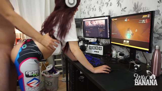 Enquanto ela está jogando de pé, o cara da Miss Banana vem de trás e a salta. Ela se distrai, mas sem perder o jogo, e toma um creampie