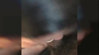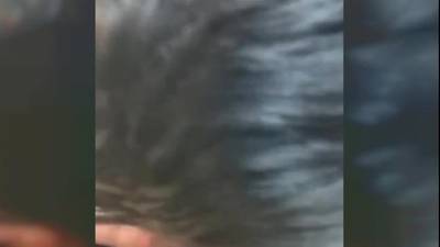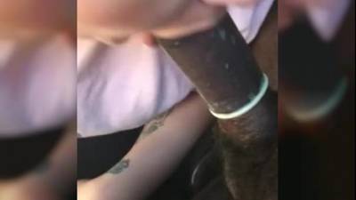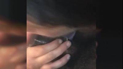 Essa cena da POV nos mostra uma mulher de cabelos escuros chupando um grande galo preto que está coberto por um preservativo