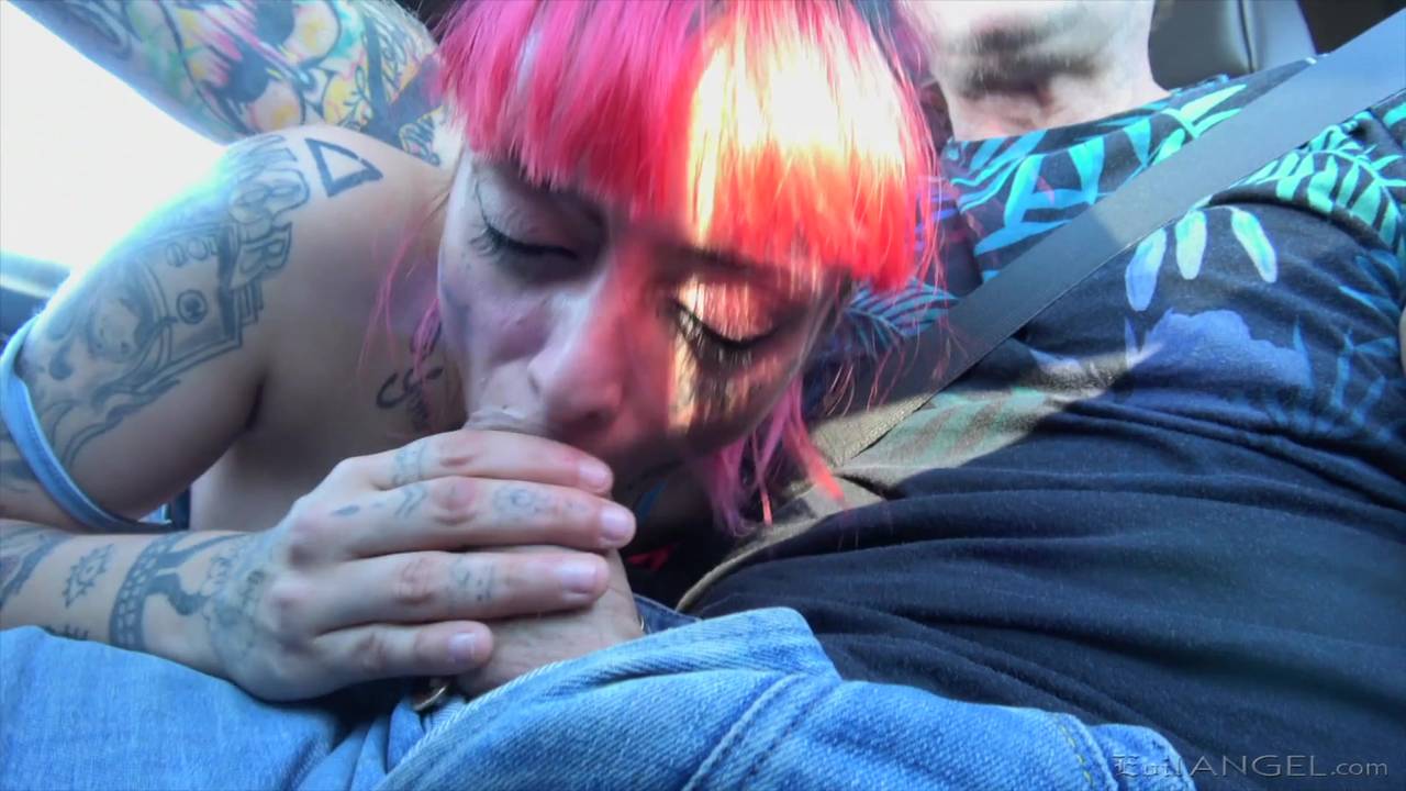 Esta espanhola novinha e toda tatuada é uma verdadeira puta. Ela começa a se masturbar no carro, chupa o pau do velho e eles param para trepar na rua!