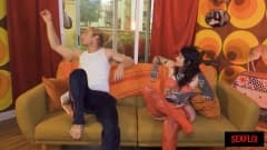 Um casal chama uma amiga para uma brincadeira. Eles começam com um trenzinho com strapon, lamem a bunda do cara, metem um punho e o fodem com strapon!