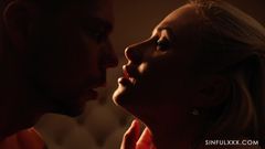 Uma cena escura e muito erótica no boudoir de uma mulher. Anna Polina e Vinna Reed começam acariciando e picando e quando um cara aparece.