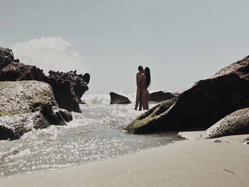 Um casal caminha nu de mãos dadas pela praia, depois se beija e faz amor na areia.