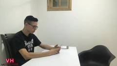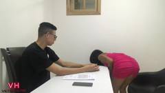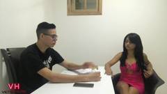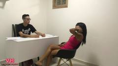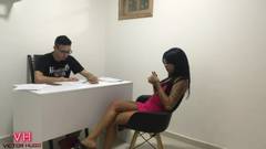 Uma jovem morena com um vestido sexy veio para uma entrevista de emprego, mas rapidamente seduz o recrutador e fode ele como uma puta
