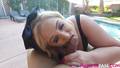 A gostosa BBW, de peitos grandes, chupa um pau na piscina e se senta sobre ele, no estilo cowgirl. Ela sai e recebe um tratamento facial, ao ar livre.