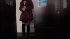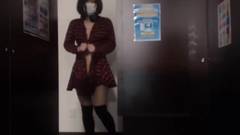 Uma jovem asiática com peitos grandes tem uma máscara no rosto, está no provador de uma loja e, em vez de medir suas roupas, começa a se tocar.