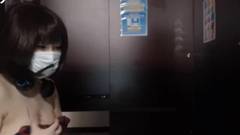 Uma jovem asiática mascarada se toca dentro de uma cabine