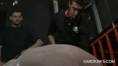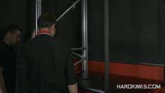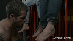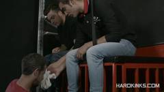 Esse cara está em uma jaula, quando os dois alfas o libertam para chutá-lo e lamber seus sapatos e pés. Fetiche satisfeito, seus bastardos!