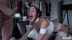 A bela Shaiden Rouge, vestida com uma lingerie branca sexy, ajoelha-se na frente do cara e chupa apaixonadamente seu pênis com sua garganta profunda.