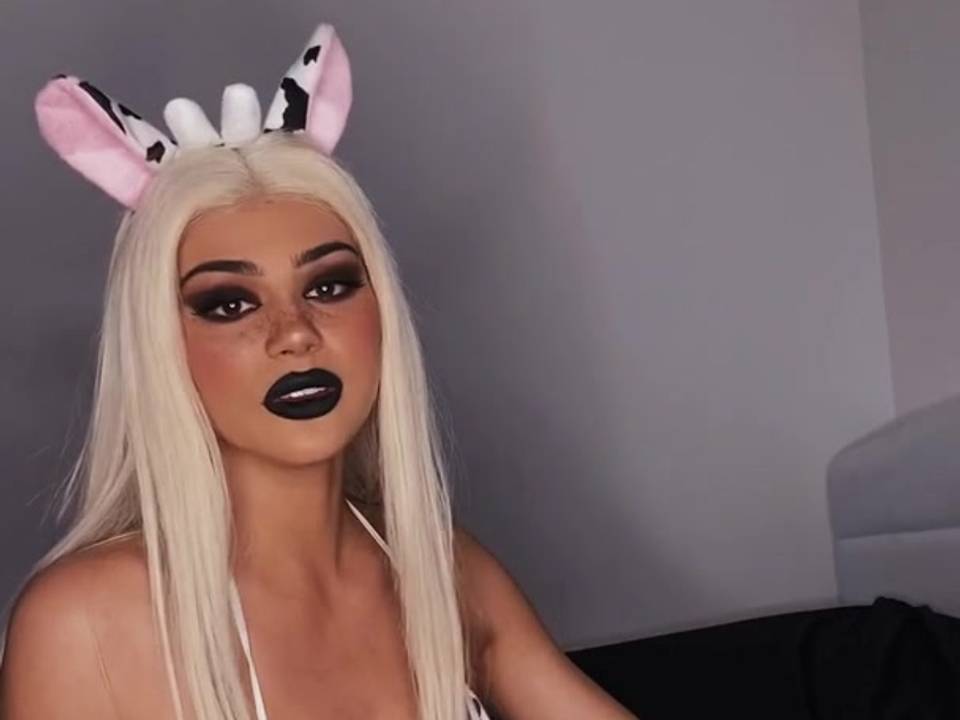 Loira com biquíni sexy e orelhas de vaca, ela quer impressioná-lo com o máximo de sexo possível.