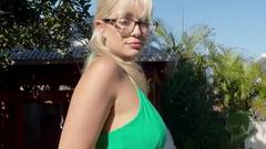 Loira de óculos dedilha sua buceta ao ar livre