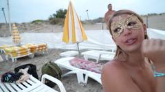 Boquete na praia de uma garota sexy e nua com uma máscara