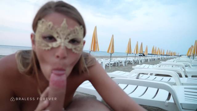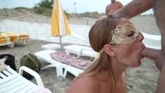 Usando uma máscara, essa sexy garota nua chupa o pau de um homem na praia ao nascer do sol e deixa que ele ejacule em seus belos seios antes de se divertir.