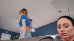 Money Birdette, amante de esperma, compete com Lucy Foxx pelo pênis de Ethan, ambas fazendo boquetes e lutando para engolir sua carga em um trio.