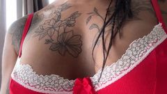 Esta tarde Prisca vestiu um avental novo que a deixa bem sexy se masturbando, e ao colocar os peitos para fora, ela pega um dildo para se penetrar.