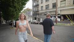 Kaylee aceita o desafio de andar pelas ruas com os seios à mostra