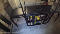Mesmo em uma gaiola, ele transa com esse cara subjugado e amarrado.