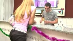 Esta transexual loira vai pedir comida e tem preferência por uma salsicha grossa e isso é exatamente o que ela recebe, em sua bunda, e ela ama cada instante!