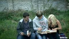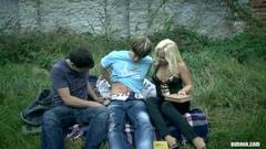Estes dois bissexuais querem aproveitar este momento com um mulher loira gostosa, transando ao ar livre. Assista.