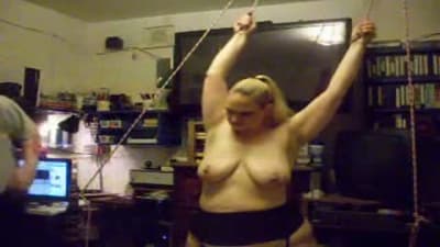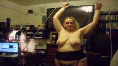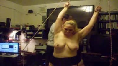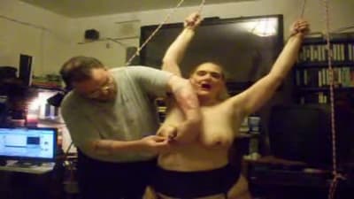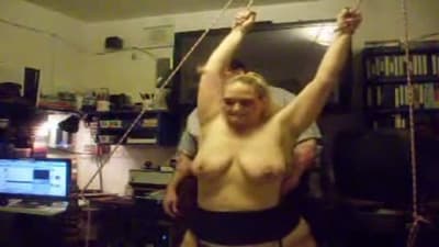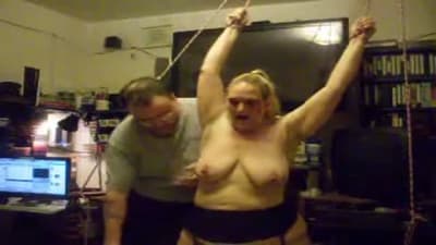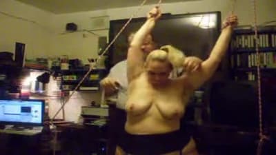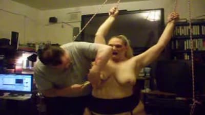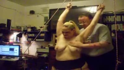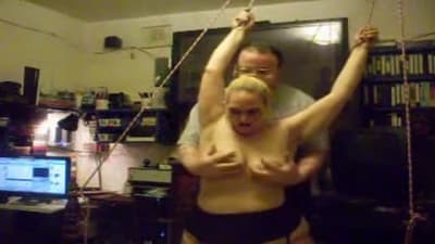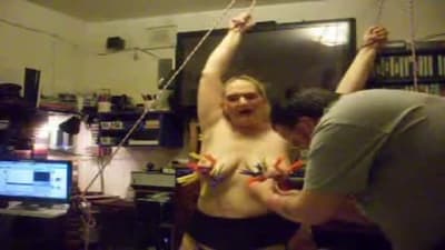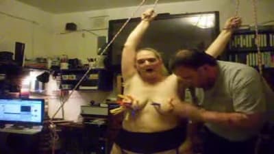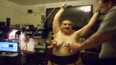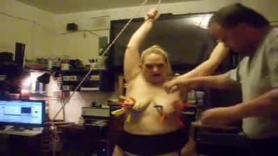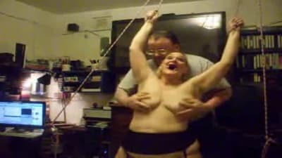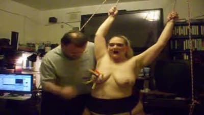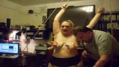Esta grande madura vai gozar quando seu homem a amarra e aproveita para beliscar os mamilos de seus seios grandes com prendedores de roupa.