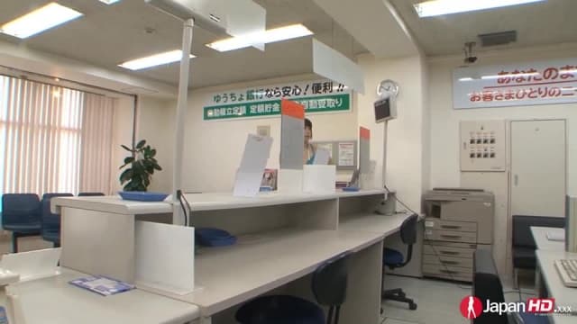 A garota está no banco à espera para ser atendida e começa a se masturbar. Os dois atendentes ficam loucos de tesão e partem pra cima pra ganhar um boquete