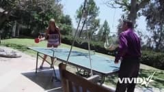 Essa loira safada está cheia de vontade de dar para o melhor amigo do pai. Depois do ping pong, ela leva o cara para sofá para brincar com seus peitões!