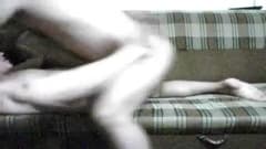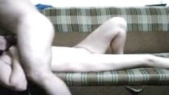 Este cara gosta de brincar com sua esposa no sofá, completamente nua, e chupar sua vagina pouco antes de ejacular em seu rosto.